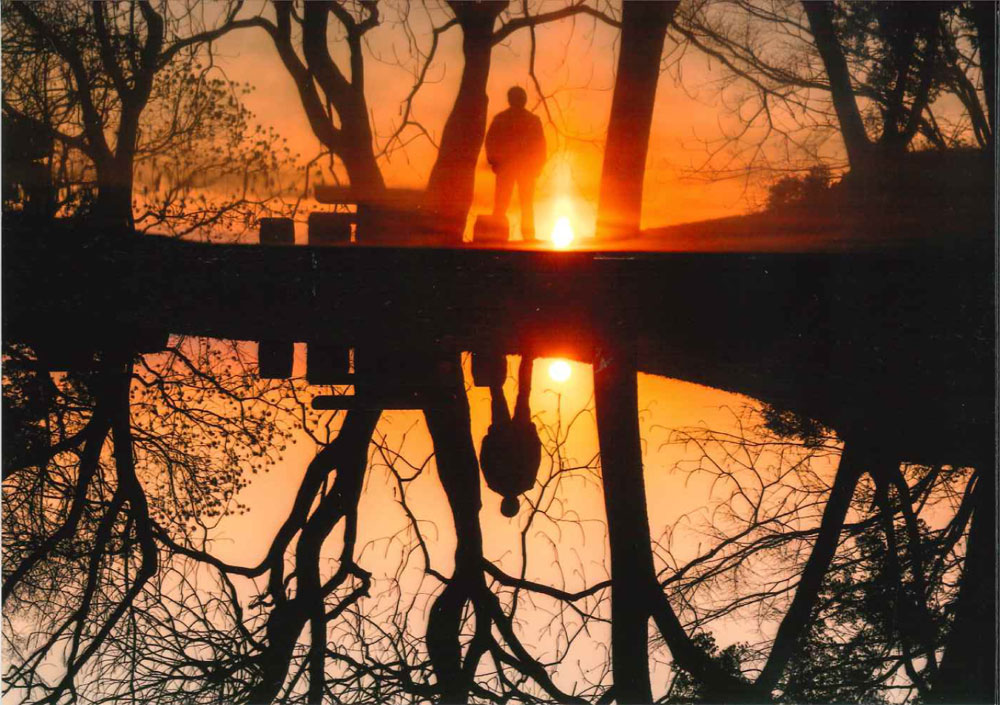 黄昏と落葉した木々とを石のテーブル反射を介して見事な冬景色を表現した作品